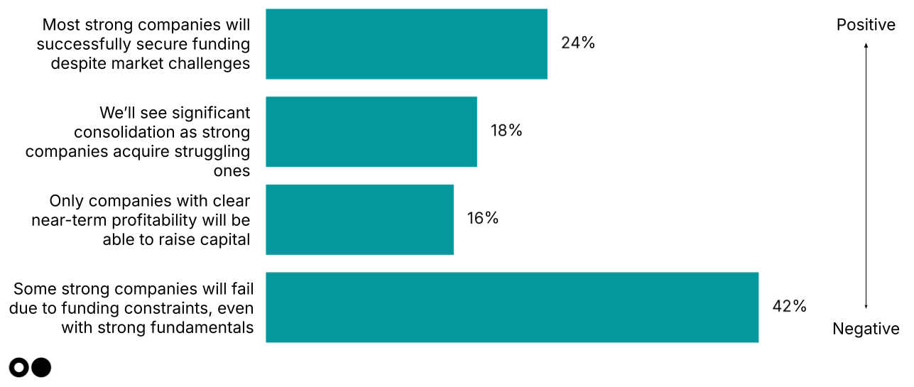 With the market in a chill, the biggest cohort (42%) anticipate more bankruptcies. This pessimism isn’t just about weak businesses getting weeded out; it's a signal that capital constraints are biting across the board, especially for companies without near-term profitability or flashy returns. Capital access isn’t just a matter of business model clarity but market liquidity.
