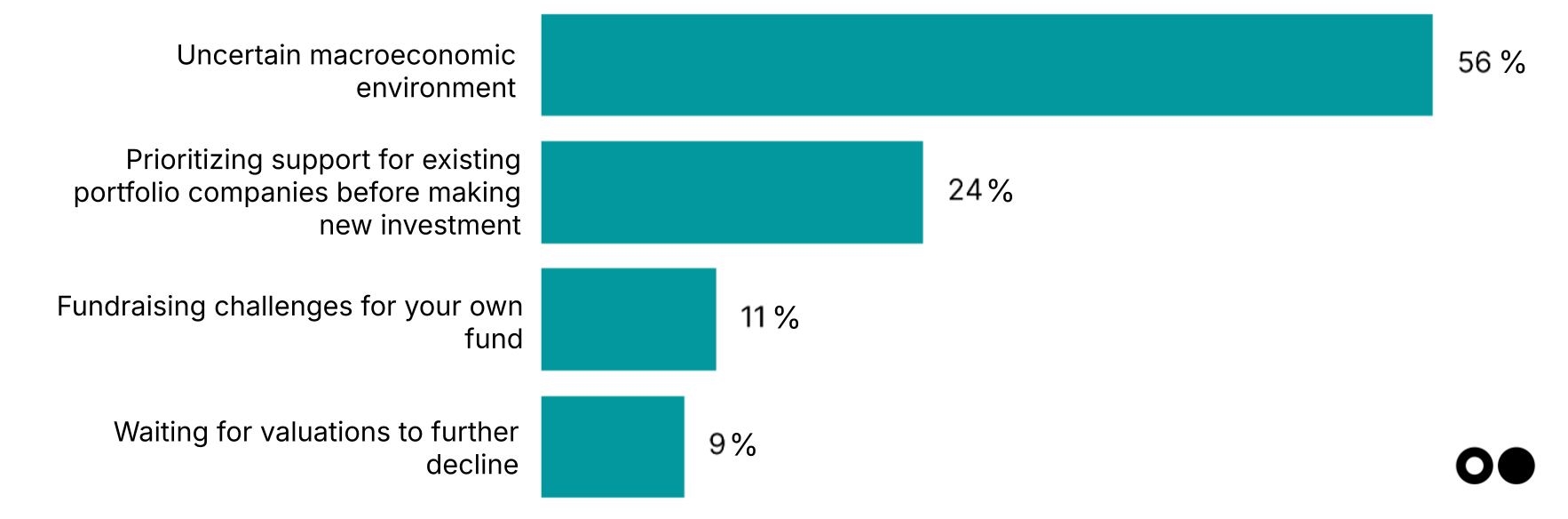 Macro clouds dominate the slowdown narrative. 56% of investors who’ve hit pause cite the uncertain macro environment, like high interest rates, sticky inflation, and geopolitical risk, as the top reason for dialing back. Another 24% are retrenching to support existing portfolios, signaling triage mode as runway extensions and inside rounds take priority. This fits with other trends in the investment space, like more bridge rounds among startups that can’t raise larger graduating rounds.