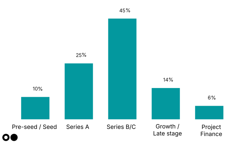 The Valley of Death looms large. Series B and C stages are expected to face the biggest funding challenges, as many climate tech startups have reached this scale-up phase, just as the funding environment is recovering from the 2021–2022 surge.