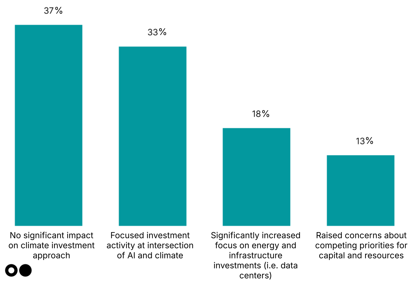 AI is reshaping investment patterns. The majority (33% and 18% together) are considering AI in decisions. Of course, AI power demand is creating new opportunities for startups in the energy space. We’ve even heard that some investors are backing earlier-stage startups with leaner teams, who can leverage AI to increase productivity.