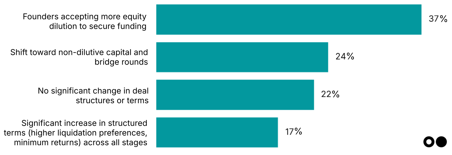 The capital stack is getting more creative, and more expensive for founders. In a colder market, 37% of respondents report founders accepting greater dilution to get deals done, while 24% highlight a turn toward non-dilutive capital or bridge rounds to stretch runway. But creativity comes with cost: structured terms like liquidation preferences and return minimums are rising (17%), meaning capital may be flowing, but on tougher terms. Founders are blending sources to close gaps, but often at the expense of ownership and flexibility.