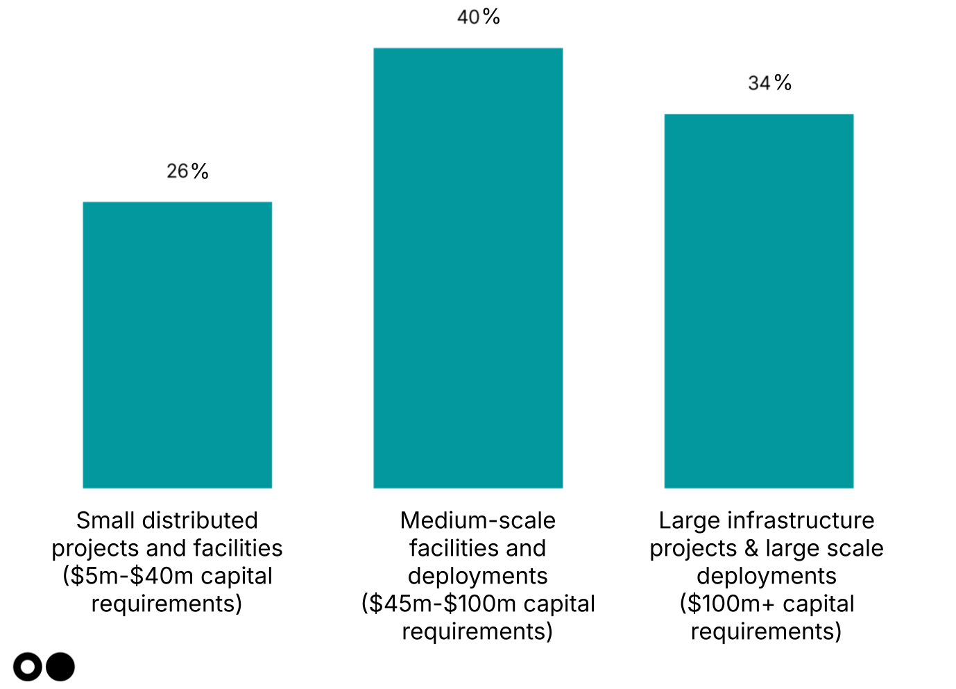 There’s a missing middle within the missing middle. 40% of respondents flagged $45m–$100m deployments as the hardest to fund — too large for venture, too small for infra. This specific midsize slice of the broader scale gap continues to challenge project developers and financiers alike.