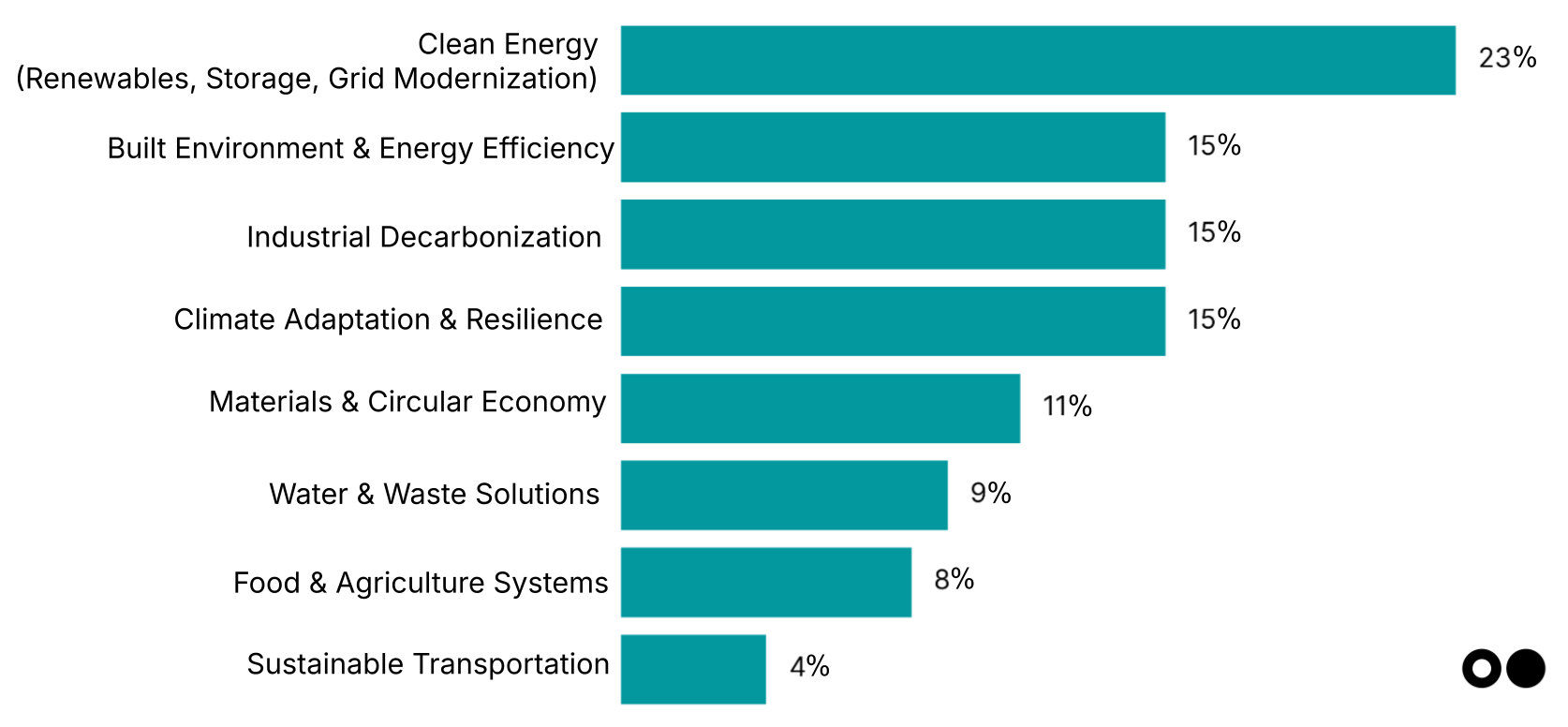Clean energy still tops investor interest (23%), holding its lead even as overall climate funding cooled — a signal of continued conviction in the sector’s central role in the energy transition. The sector’s lead isn’t just hype — clean energy funding rose 12% in 2024 to $9.4bn, signaling continued momentum as capital flocks to (relatively) de-risked climate plays.