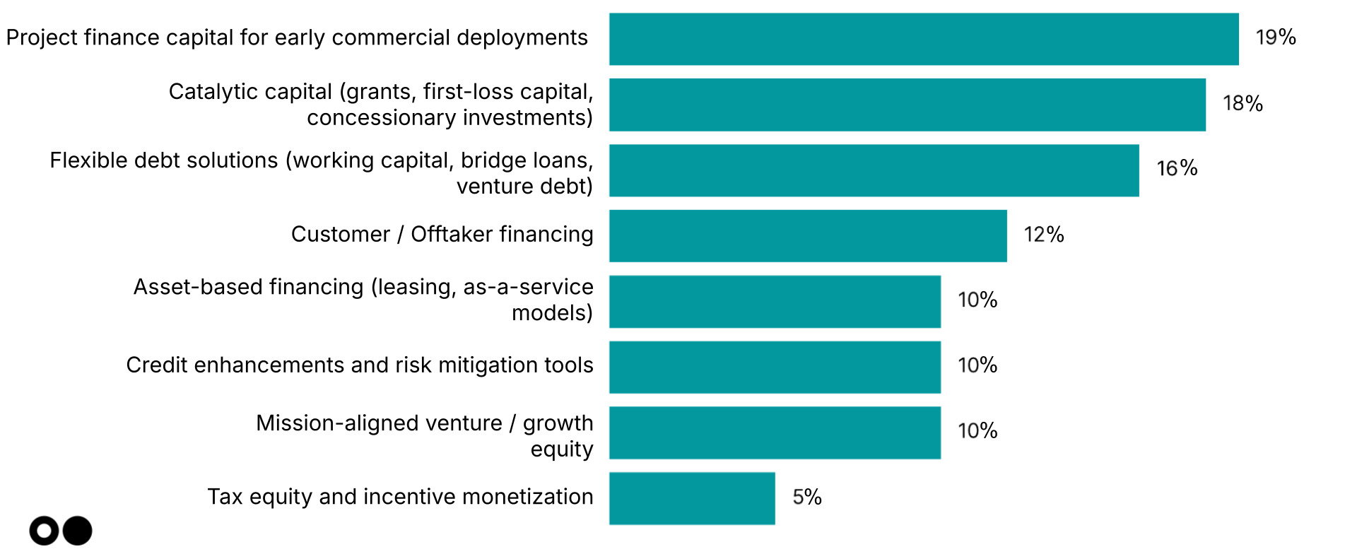 Project finance (19%) and catalytic capital (18%) top the scale-gap toolkit, signaling a shift away from pure venture toward structure-heavy stacks for early commercial deployments. Flexible debt and offtaker financing aren’t far behind.