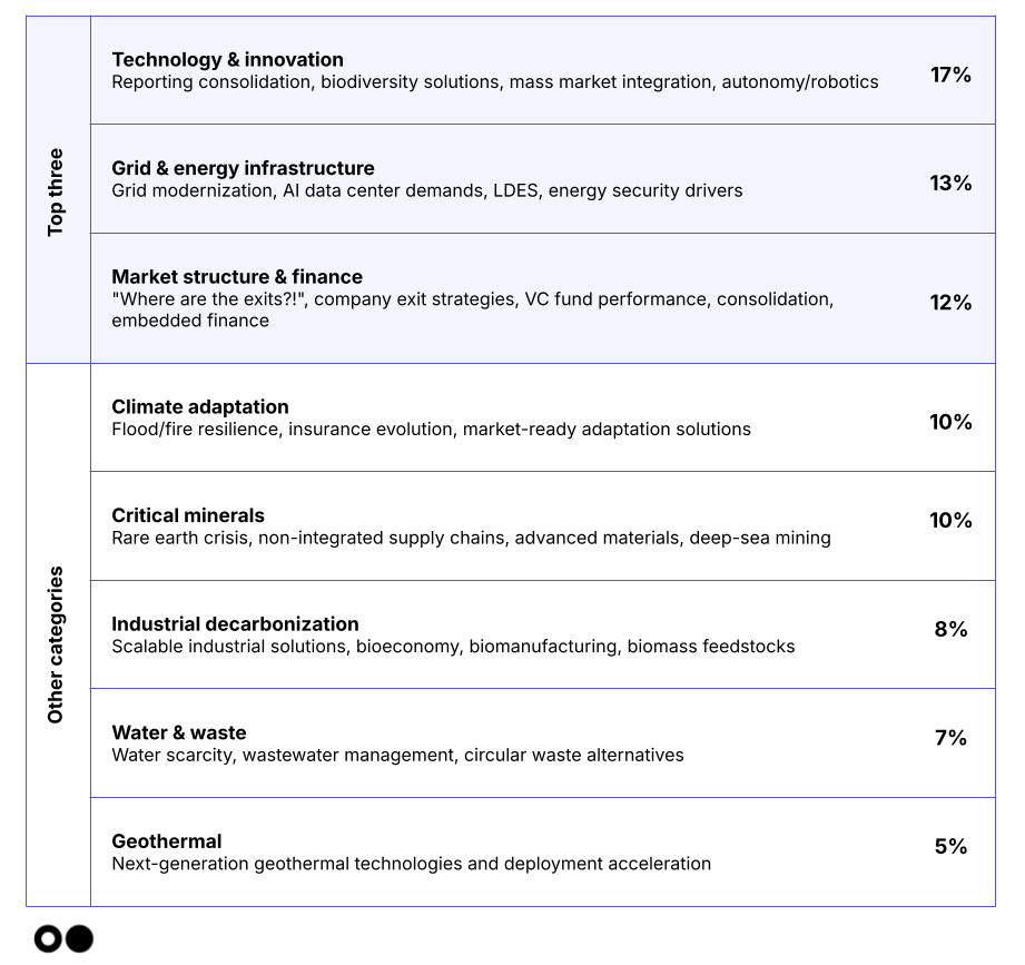 The top hits are there, but of note: workforce is a notably overlooked factor in climate tech scaling. Despite the capital-intensive focus of most climate discussions, one investor highlighted a critical blind spot: "If you don't pay attention to labor as a cleantech company, you will fail." Land use change projects — essential for agriculture and renewable energy development — cannot scale without addressing workforce realities. As climate technologies move from pilots to commercial scale, the availability of skilled and legally authorized workers may prove as constraining as capital availability — a reality that could derail even well-funded projects if not proactively addressed.