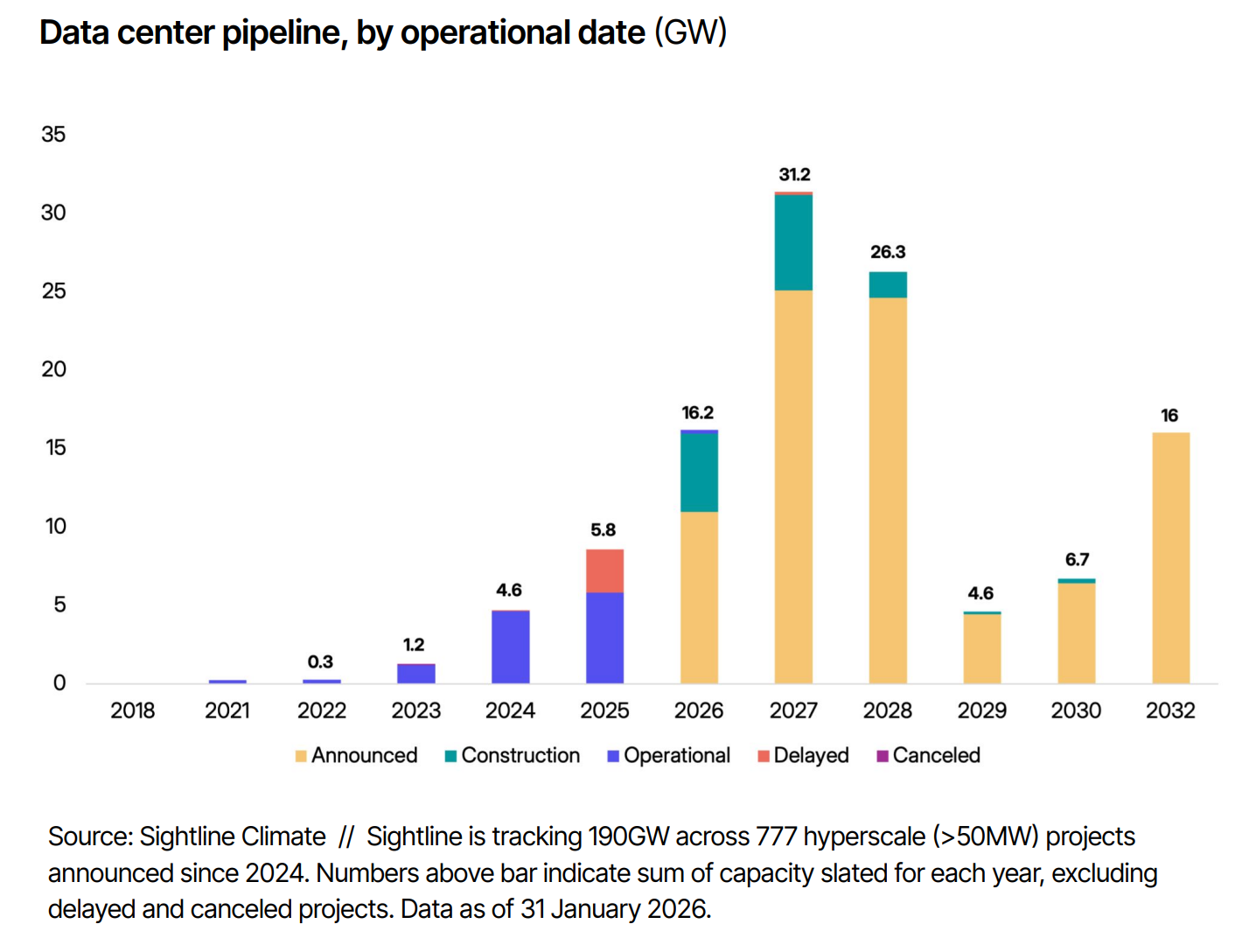 Q1 2026 Data Center Outlook. Our first outlook diving into the data center project pipeline to analyze progress. With 16GW due online in 2026, only 5GW is real right now. Clients can read it here.