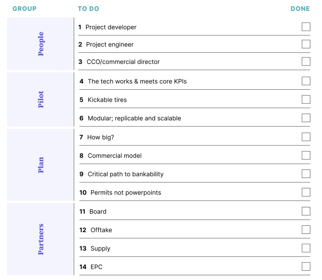 1: Planning phase – Helping startups map risks, develop commercialization strategies, and prepare for project finance, for up to six months, depending on the existing state and maturity of the project. It’s like measuring twice, cutting once. We’ve got to allow ourselves and the founders time to really make sure we’re on the same page about what makes sense and what the risk profile looks like. In a sense, it’s about helping them understand diligence and how to think like project developers. We like to say that – unlike your project financier – we’re not doing diligence “on” you, we’re doing diligence “with” you. We also need to get to know each other and give them tangible, strategic work like development plans, schedules and budgets that will actually drive value for their next steps.
