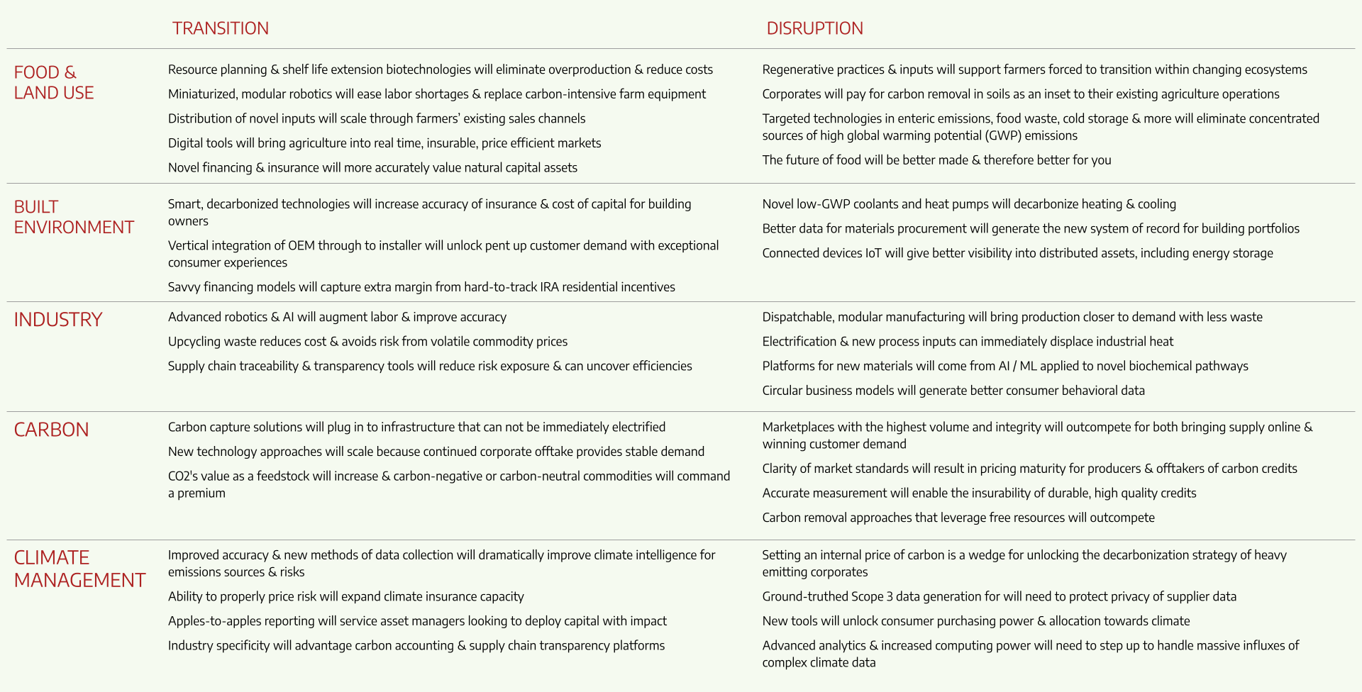 Climate is a persistent driving force that will generate massive physical and market transformations. Broadly, we see opportunity in climate aheadâboth in transitioning existing, incumbent businesses and in creating new disruptive markets.