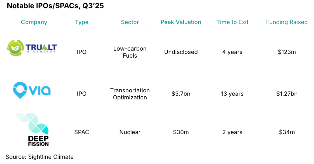 Yes, real IPOs happened this quarter. But the quality varied. Via made a debut, listing at a $3.6bn valuation and becoming one of the largest publicly traded transportation optimization companies in the US. TruAlt Bioenergy raised $123m on the strength of India’s ethanol mandate — continuing a regional trend of public market momentum. On the other end of the spectrum, Deep Fission’s $30m SPAC felt more like a nuclear publicity play than a commercial milestone. If anything, Q3’s listings showed that scale, revenue, and regulatory clarity are still prerequisites for serious IPOs — and that investor appetite remains cautious outside a handful of proven verticals.