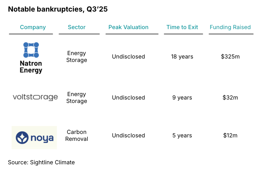Sadly, Q3 also saw more bankruptcies, especially in high capex sectors. Natron Energy, with over $300m in funding , filed for bankruptcy after 18 years and $325m raised, proving how hard it is for alternative chemistries to break lithium-ion’s grip. VoltStorage quietly shut down after nine years and $32m, another victim of scale barriers in storage. And in carbon removal, Noya folded after just five years and $12m raised, a cautionary tale of how unforgiving direct air capture can be without deep pockets, stable offtake, and policy support.