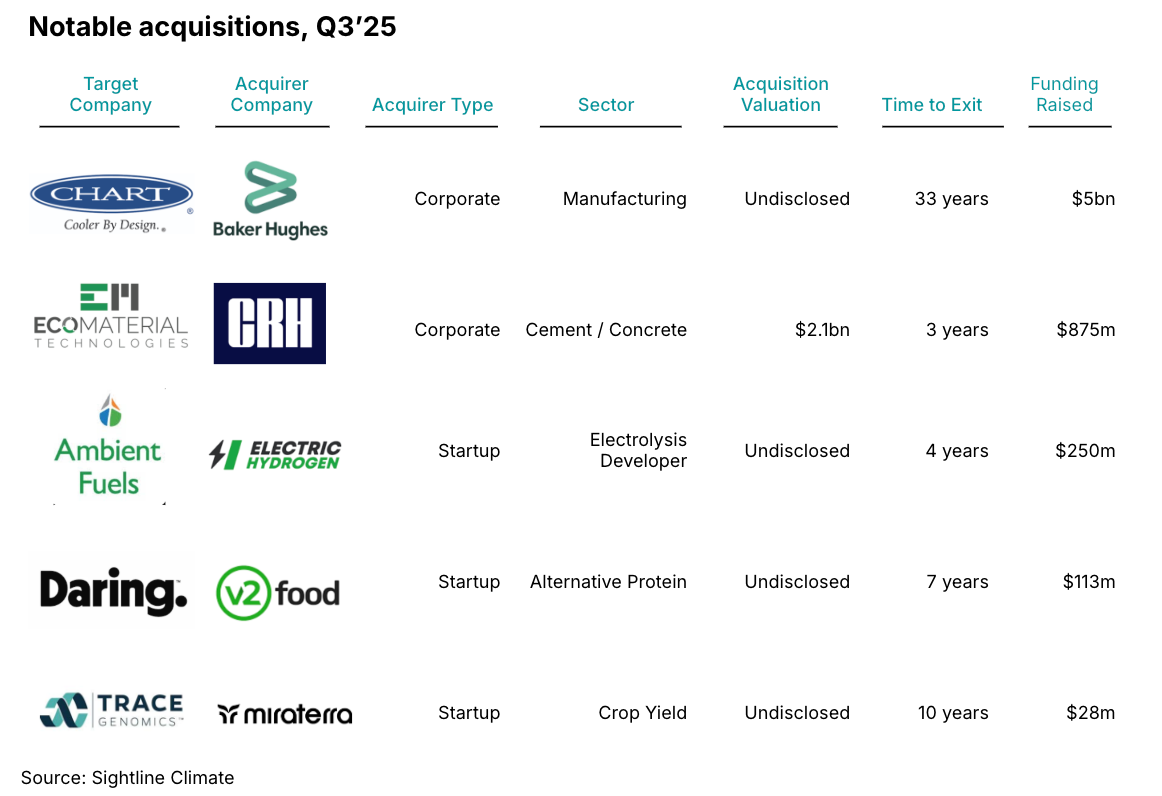 Q3 was marked by a wave of strategic M&A, led by industrial buyers consolidating critical technologies and bigger startups scooping up smaller ones. Baker Hughes’ acquisition of Chart Industries folded its tech for gas, hydrogen, and liquid handling into its energy systems portfolio. CRH’s $2.1bn purchase of Eco Material Technologies secured upstream cement inputs as the construction sector bets on decarbonization. Electric Hydrogen’s quiet acquisition of Ambient Fuels, though undisclosed, looks like an IP and pipeline grab to speed up execution. Even in agtech, where outcomes are smaller, exits continued quietly with Trace Genomics and Daring changing hands.