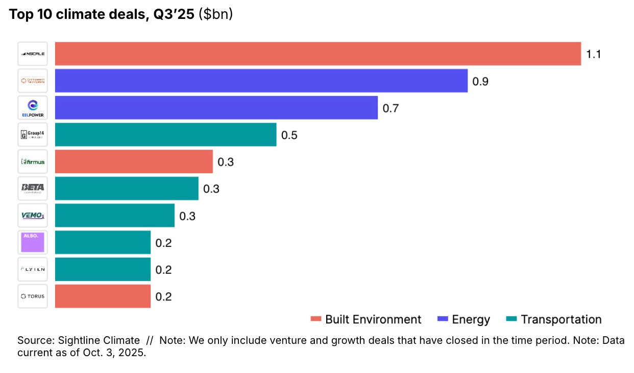 Taken together, Q3’s biggest deals show climate capital continuing to flow toward infrastructure-heavy solutions — especially those with clear regulatory support, commercial offtake potential, or relevance to the energy-AI nexus. A lot of the quarter’s heat comes from hyperscaler infrastructure and fusion, where large, late-stage, or strategic rounds dominate the top decile.