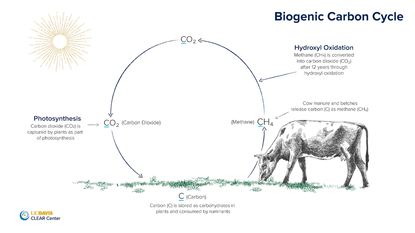 But to cut cows some slack, not all methane emissions are created equal. Cows release biogenic methane which is part of the natural biogenic carbon cycle: