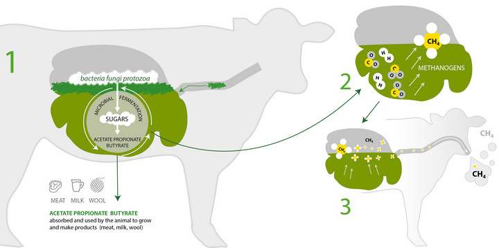 Ever considered how the rumen works? It’s quite magical. Enteric fermentation is a highly evolved process that allows ruminants (cattle, buffalo, sheep, goats, etc.) to digest cellulose, the basic component of plant cell walls. Rumen microbes ferment simple and complex carbohydrates like cellulose to produce volatile fatty acids (VFAs), which satisfy ~70% of the animal’s energy requirements. The rub comes when the production of certain VFAs also produces hydrogen (H2), which methanogens then convert to CH4. Cellulose in, CH4 out.