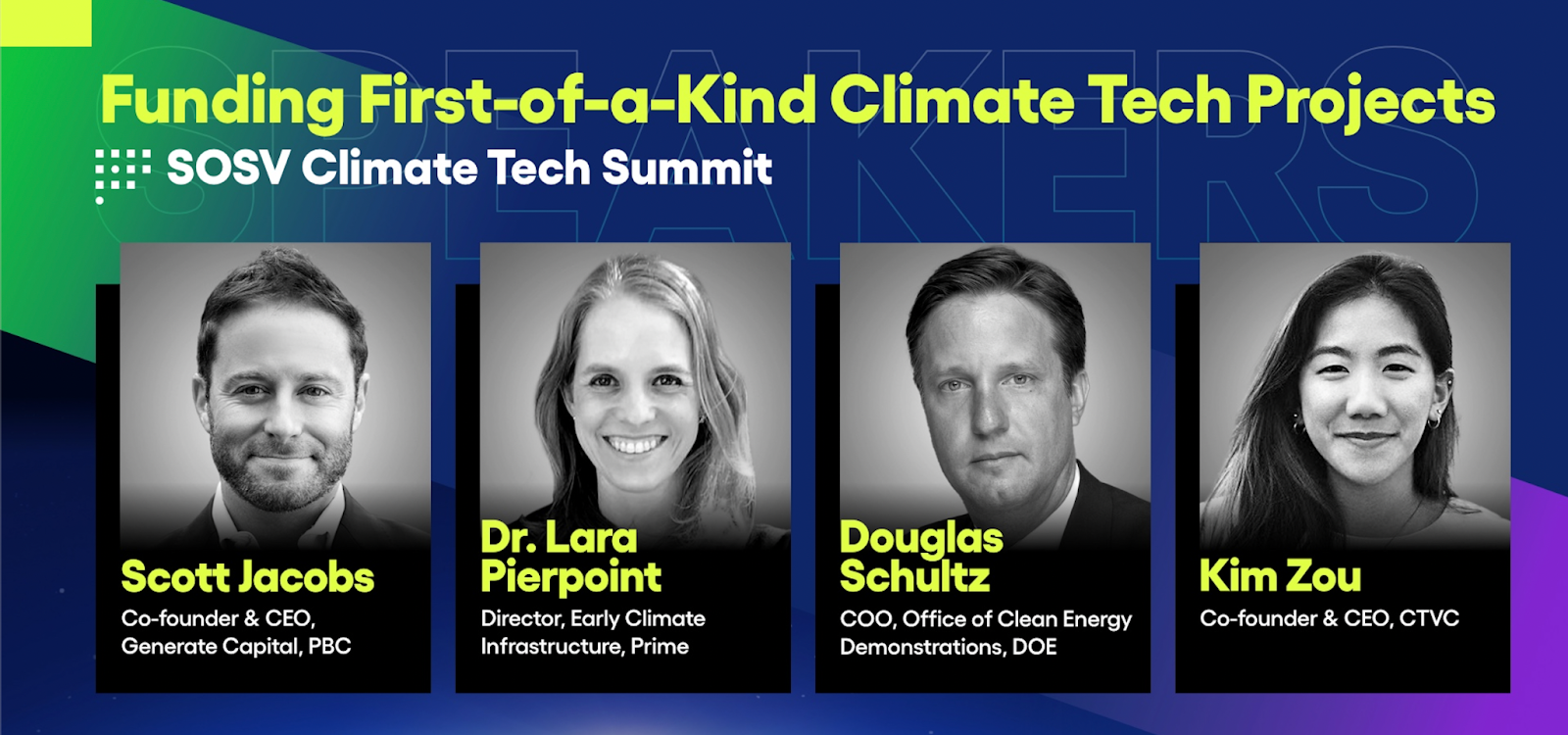 At SOSVâs Climate Tech Summit last week, Kim facilitated a conversation between investors across the Climate Capital Stackâincluding government, philanthropic, and private sources of fundingâfocused on functionally financing those finicky FOAK projects. The full discussion with Douglas Schultz, Chief Operating Officer of the DOEâs Office of Clean Energy Demonstrations (OCED), Dr. Lara Pierpoint, Director of Prime Coalitionâs Early Climate Infrastructure (ECI) program, and Scott Jacobs, CEO and Co-founder of Generate, is available on YouTube. For those who prefer the SparkNotes version, what follows are a few highlights and a skimmable Q&A, edited for length and clarity.