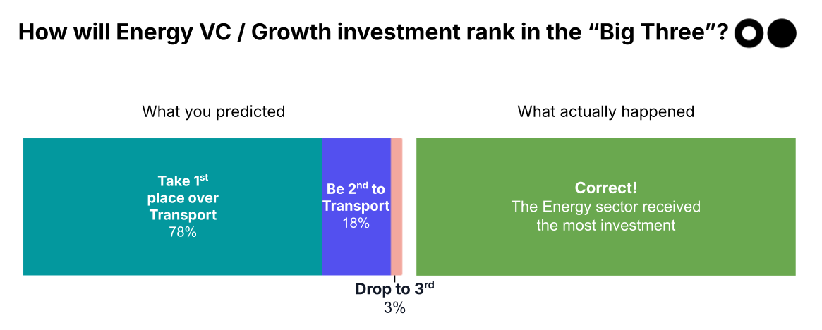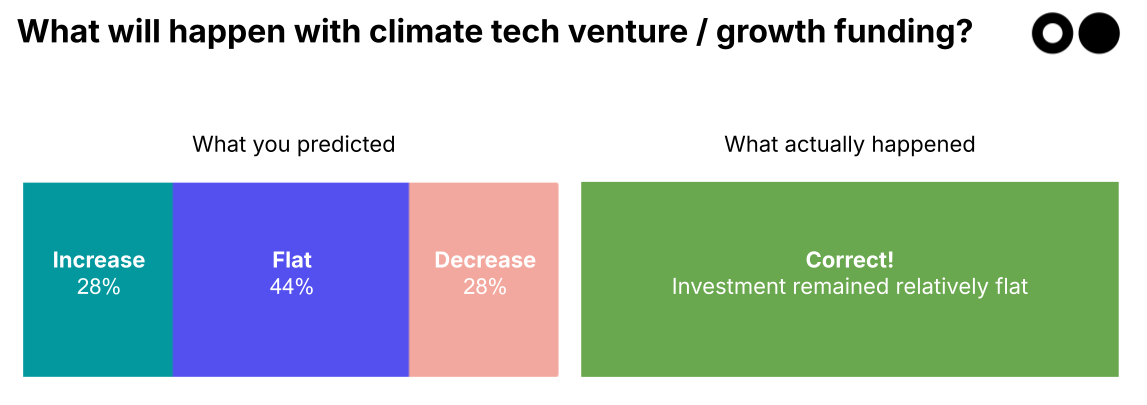 Prediction: Opinion was divided; 28% foresaw a clean rebound after the messy 2023–2024 reset, 28% expected a slow grind, lower than before, but the largest group — 44% — believed we’d settle into a new, structurally lower “normal” for climate tech VC and growth