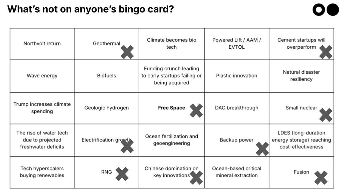 Well, not quite bingo, but definitely not a blank card either! Clearly, geothermal was on people's bingo cards. Sustainable cement hit milestones with Brevik. Small nuclear had some big moments. Electrification has continued, and backup power is increasingly an option for data centers. The RNG market grew this year. China continues to dominate in key climate tech areas, and fusion scored some of the most massive funding rounds we've seen.
