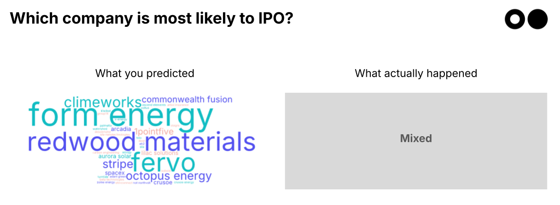 Predictions: Your top guesses were Form Energy, Climeworks, Redwood Materials, and Fervo.